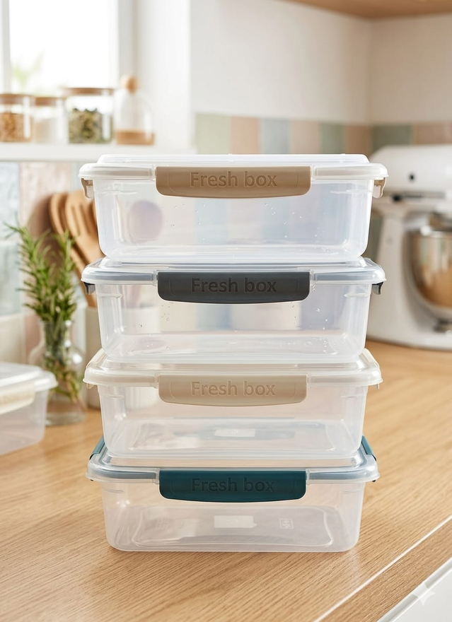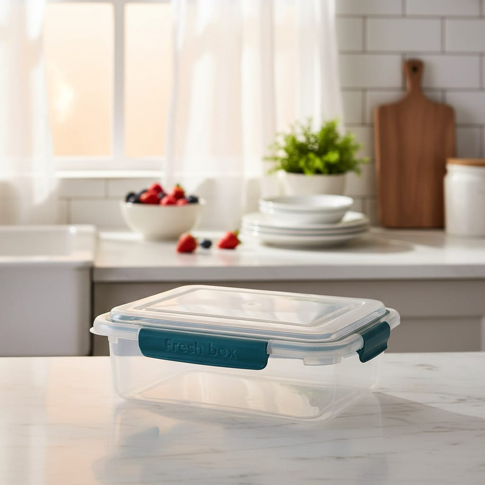(Diseñado para mantener la frescura mediante cierres herméticos. Estos recipientes están fabricados en plástico de alta resistencia y cuentan con tapas que incluyen cuatro trabas laterales para asegurar un sello efectivo. Son aptos para su uso en lavavajillas, microondas y pueden almacenarse en el freezer).