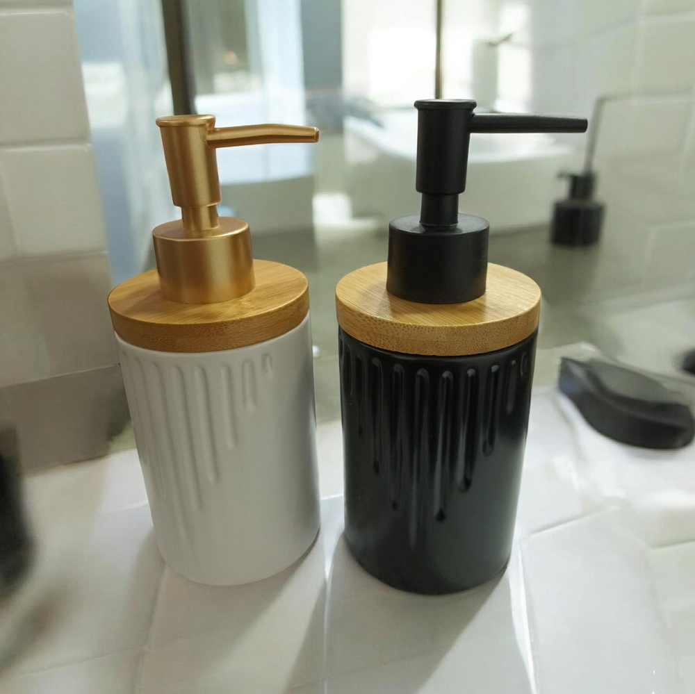 (Dispenser de cerámica para jabón liquido. Excelente calidad y terminación. Diseño con tapa de madera de bambu).