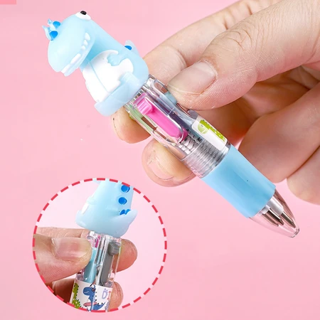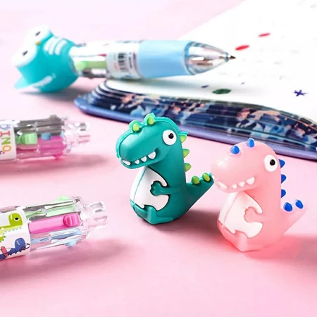 (Birome con un diseño divertido, la misma tiene un mix de colores: gris, verde, celeste y rosa. La lapicera cuenta con un sistema de "palancas", teniendo en cuenta el color con el que queremos escribir, la palanca correspondiente se podrá bajar para seleccionarlo. Como decoración tiene un dinosaurio con tonos a elección como verde, verde agua, celeste y rosa. Ideal para uso personal o de regalo. Rellena tu cartuchera con estas fabulosas lapiceras).