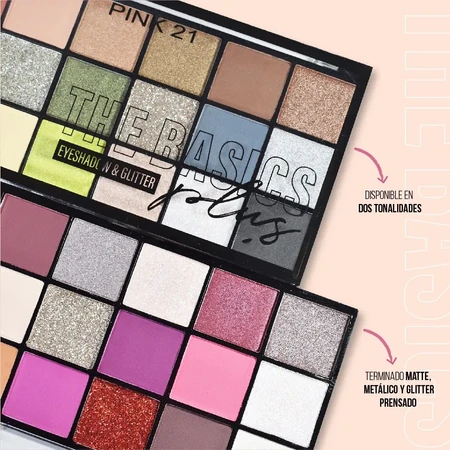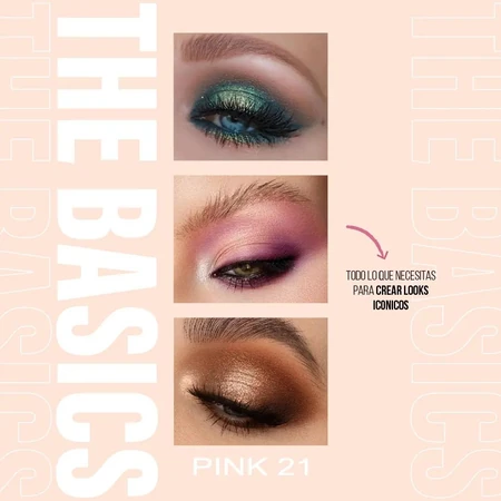 (Sombra The Basics "Pink 21". Cuenta con 8 sombras mattes, 7 satinadas y 3 glitter prensadas).