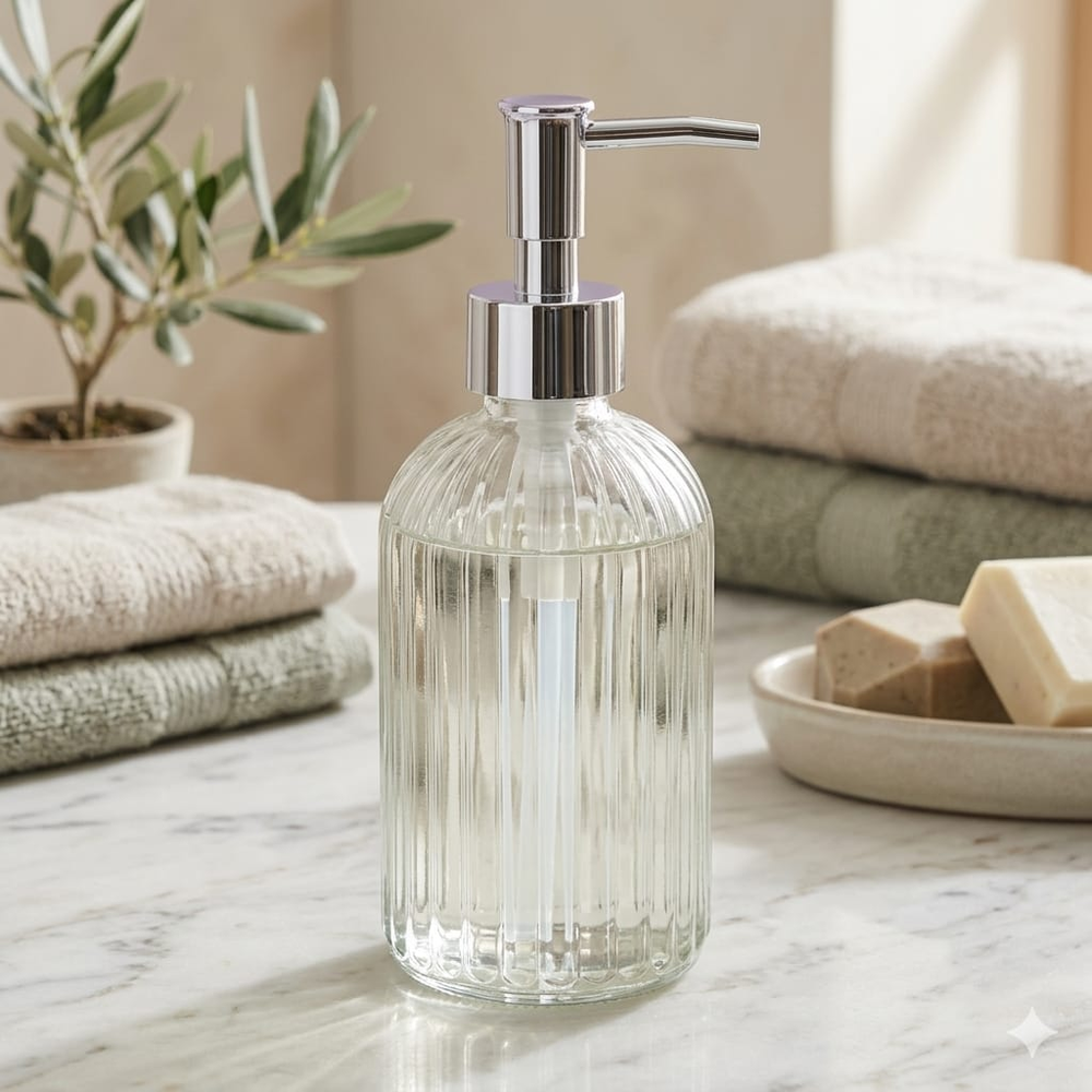 (Dispenser de vidrio con válvula de color plateado y diseño delicado en relieve. Ideal para aportar practicidad y decoración al ambiente, ya sea cocina o baño).