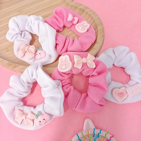 (Scrunchies Conejo Pack x 12U. Con varios dijes de diseños super bonitos, tela suave y de alta calidad, ideal para hacer cualquier peinado).