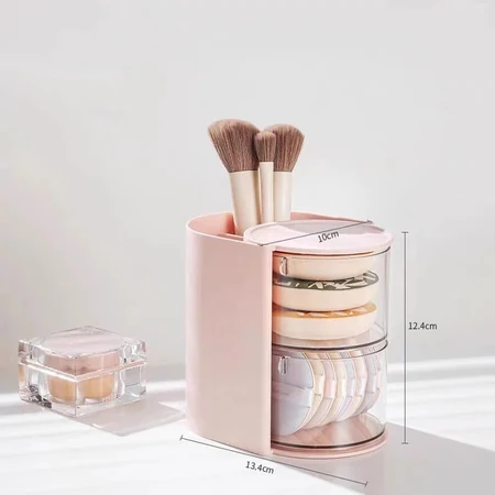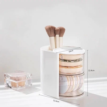 (Organizador Porta Cosmético de 2 niveles de cajoncitos redondos diseñados para guardar esponjas de base y en la parte posterior de la misma cuenta con un organizador porta brochas con 2 divisiones, excelente diseño para mantener tus cosméticos limpios y ordenados).