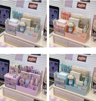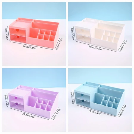 (Cuenta con dos cajones transparentes, diez compartimentos de diversos tamaños y una superficie plana multiuso. Ideal para almacenar joyería, útiles, pinceles, etc).