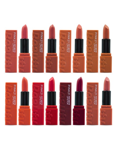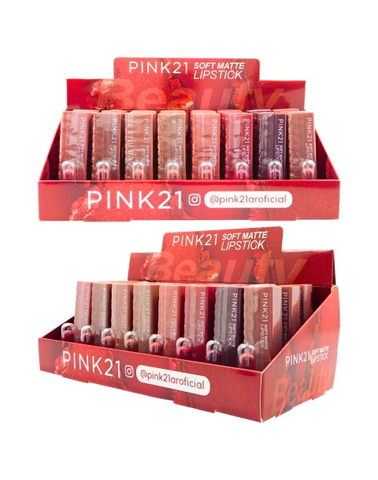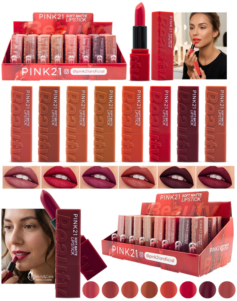 (Lápiz Labial Efecto Matte "Pink 21". De larga duración, vienen en 8 tonos distintos).