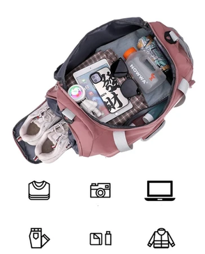 (Cuenta con 4 compartimentos exteriores (un bolsillo red, uno para calzado, uno frontal y uno posterior), un compartimiento principal que posee un bolsillo para ropa húmeda y una tira ajustable removible. Puede usarse como bolso o mochila. Ideal para deporte, uso diario y viajes).