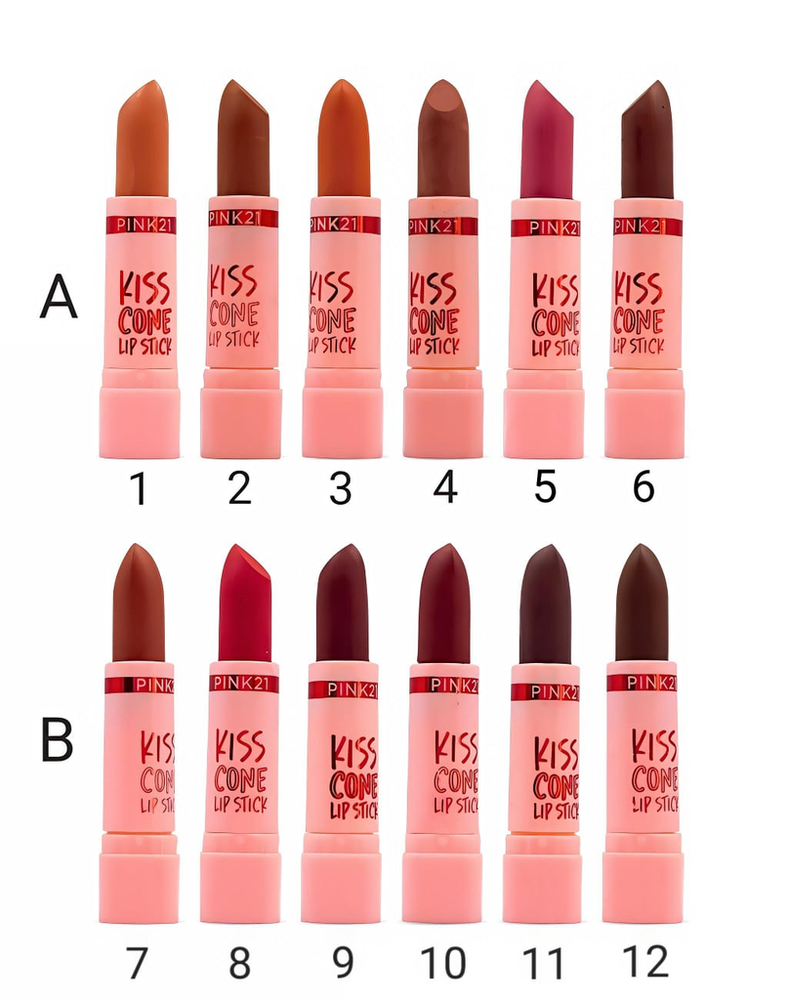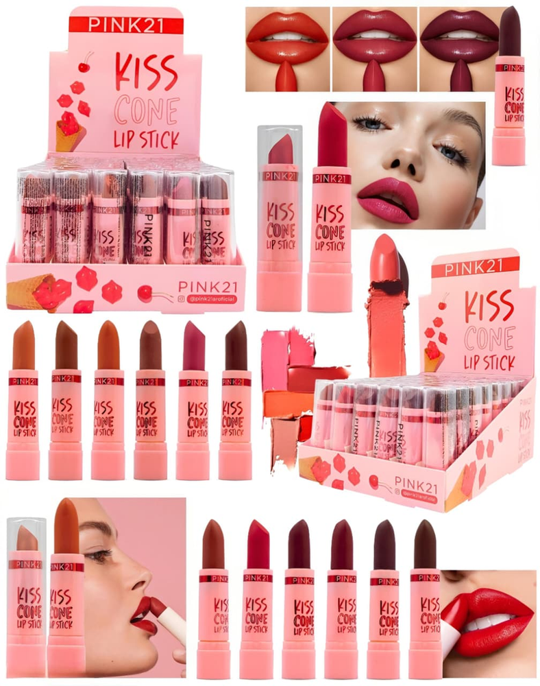 (Lápiz Labial Kiss Cone "Pink 21". De larga duración, vienen en 12 tonos distintos).