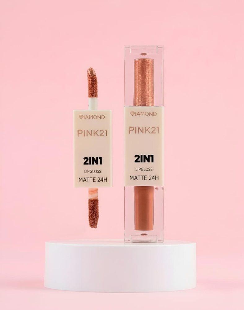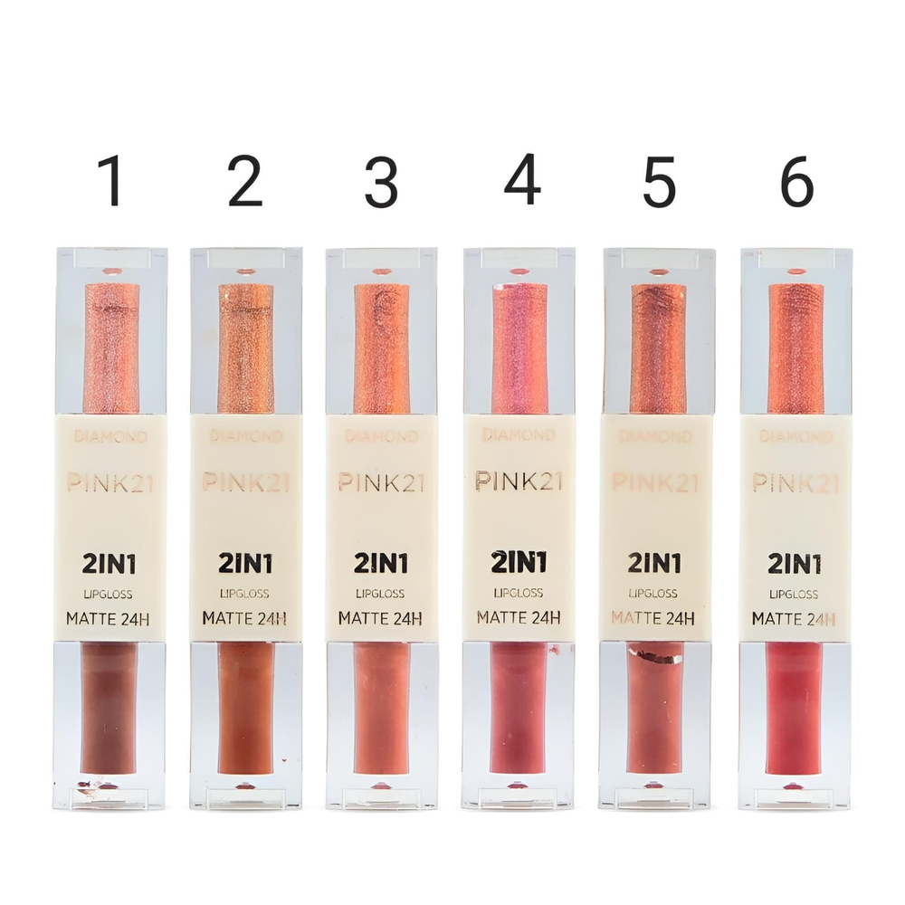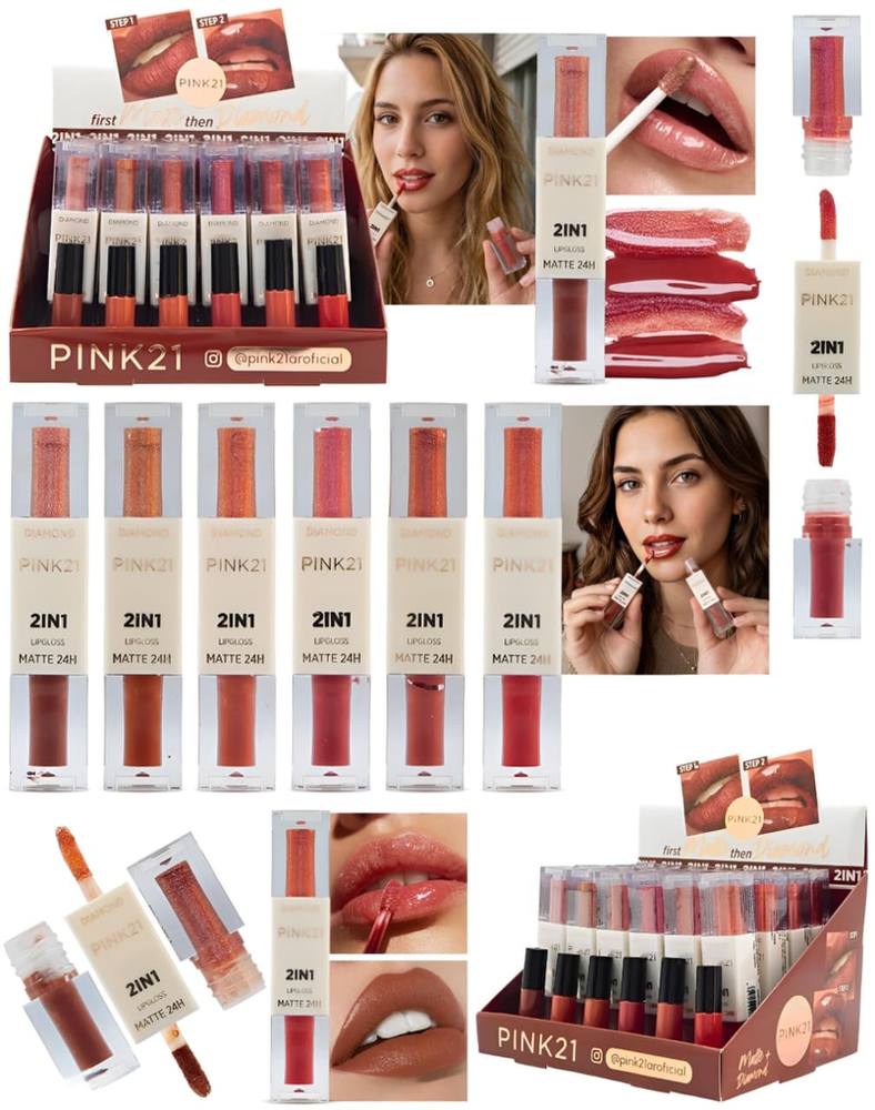 (Labial y Brillo 2 en 1 "Pink 21" acabado matte/ acabado brillo. De larga duración, vienen en 6 tonos distintos).