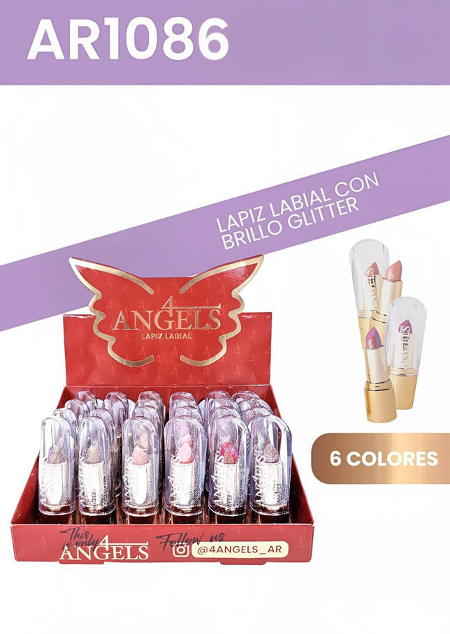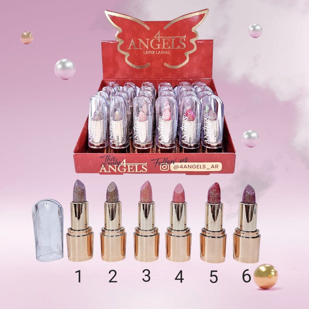 ( Lápiz Labial "4 Angels" con brillo glitter. Disponible en 6 tonos).