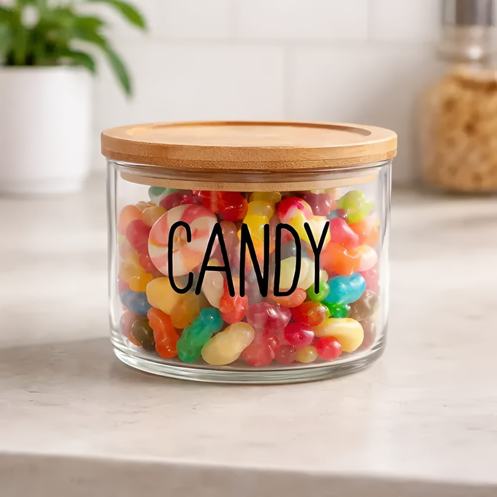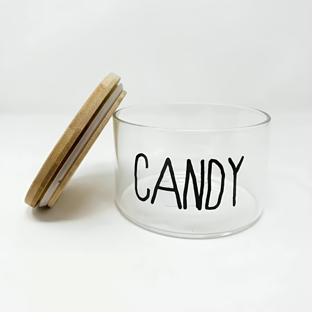 (Frasco de Vidrio "Candy", cuenta con una tapa de madera de bambú con una silicona para evitar pérdidas, cierre hermético a presión).