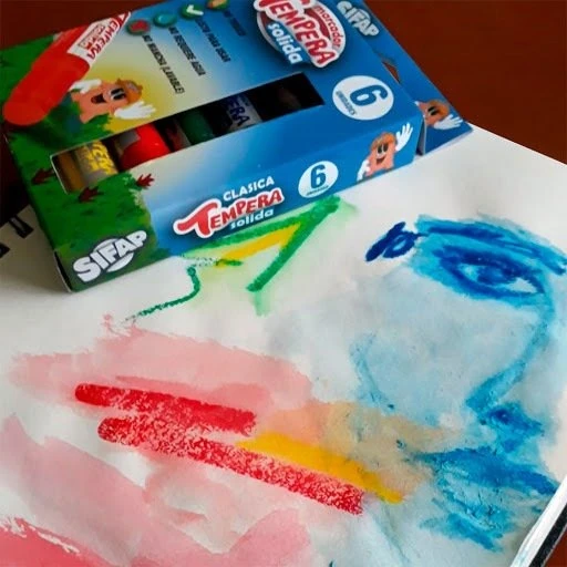 (Tempera solida marca ''Sifap'' en barra con 6 colores, amarillo, rojo, verde, azul, marrón, y negro. Practico viene en un marcador, sacas la tapa y esta listo para usar no requiere agua, cuando se te acabe solo hay que girar la parte de abajo y saldrá la barra de tempera solida, no mancha, es lavable y No es toxica. Edad recomendada para mayores de 3 años. Categorizado en: Librería)
